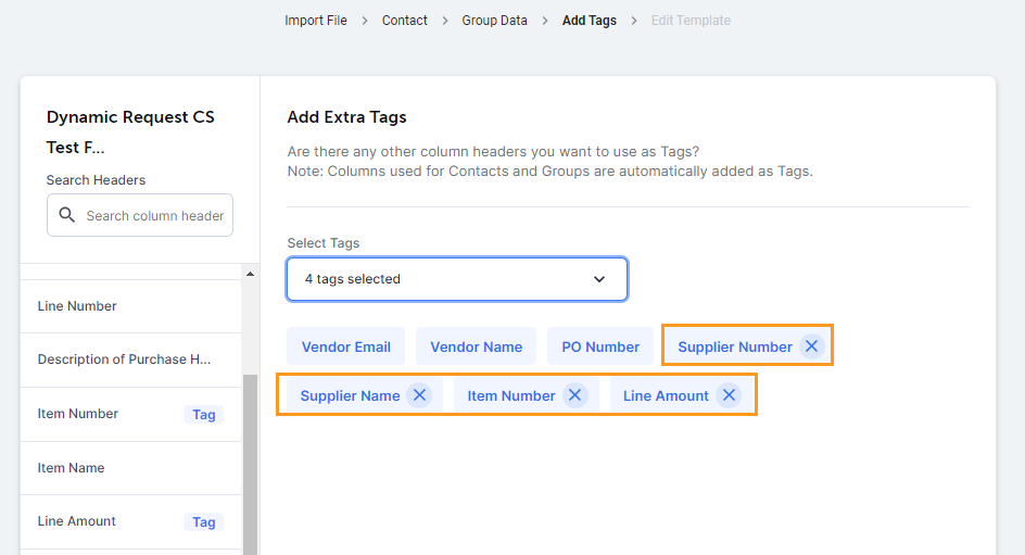Dynamic Requests can only be configured as one-time requests, since they are based on a singular data file for each send. It's not possible to add any additional contacts at this point, as all contacts are being pulled in from your data file. Your tags can be added from the dropdown, and you'll see them appear in your Preview Message based on the chosen groupings.