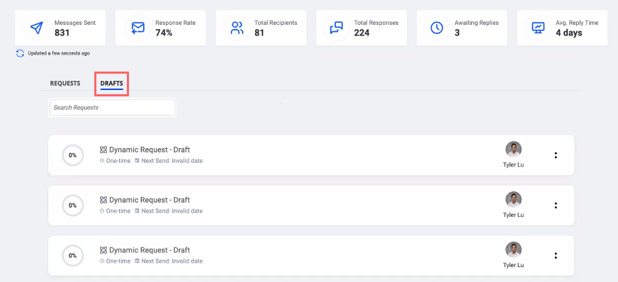 With Dynamic Requests enabled, you will have a Drafts tab available from your Request Agent home page: