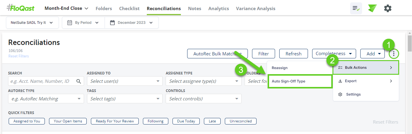 Subledger Tie-Out can also be assigned in bulk via the Auto Sign-Off Types Bulk Actions Settings located on the Reconciliations tab.