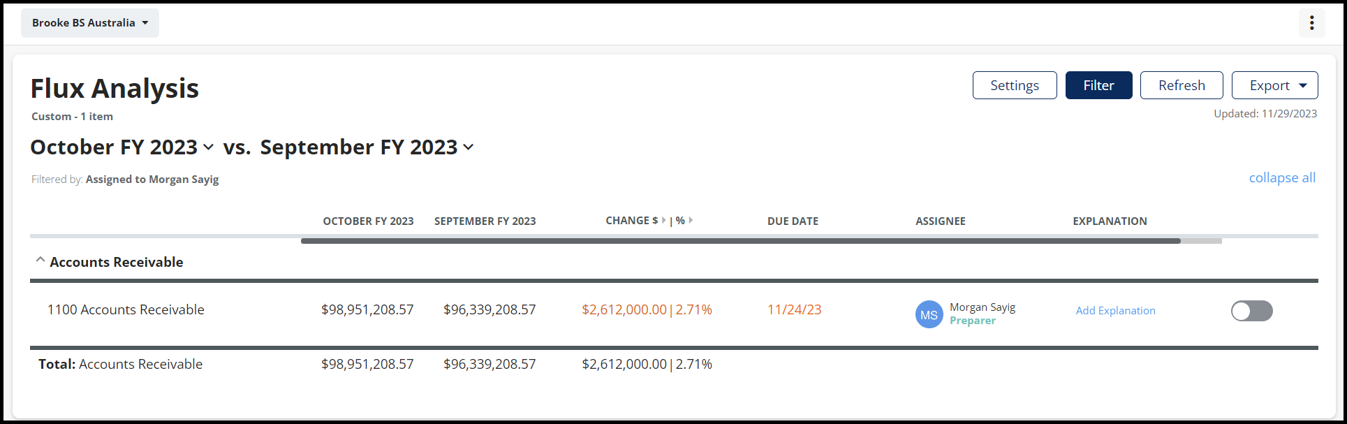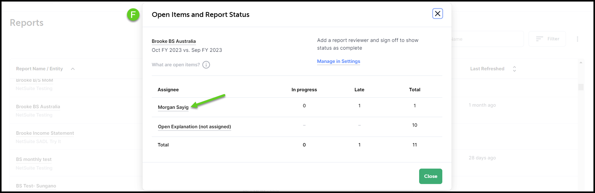 Open Items Detailed View (F): The detailed view will show a listing of assignees with open items within the report, segmented by in progress and late. Any material items that do not have assignments will be included in the “Open Explanations” line. The status of the Report Reviewer will also be shown; however, to sign off on the report, the user must do so in the report itself. Clicking on the assignee will redirect you to the report and automatically filter for items assigned to them (example below).
