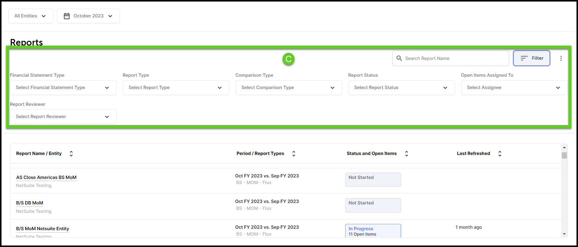 - Search / Filter Reports (C): Users are able to filter the view of their report listing by searching for key words, and filtering on attributes such as FS type, Report Type, Comparison Type, Status, and Report Reviewer.