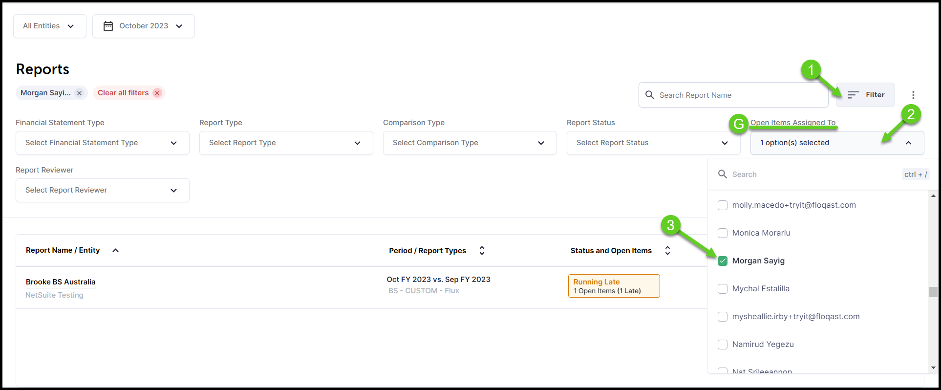 Open Item Assigne Filtering (G): Users are able to filter the report listing for reports with open items assigned to a single or multiple users. When the listing is filtered, the count of open items associated with that user(s) is what is shown for each report.