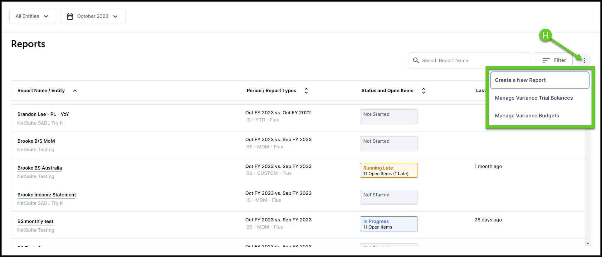 Kebab Menu (H): The kebab menu allows Managers/Admins to create a new report directly from the Dashboard page. All users can also access the Manage Variance Budgets and Manage Variance Trial Balances.