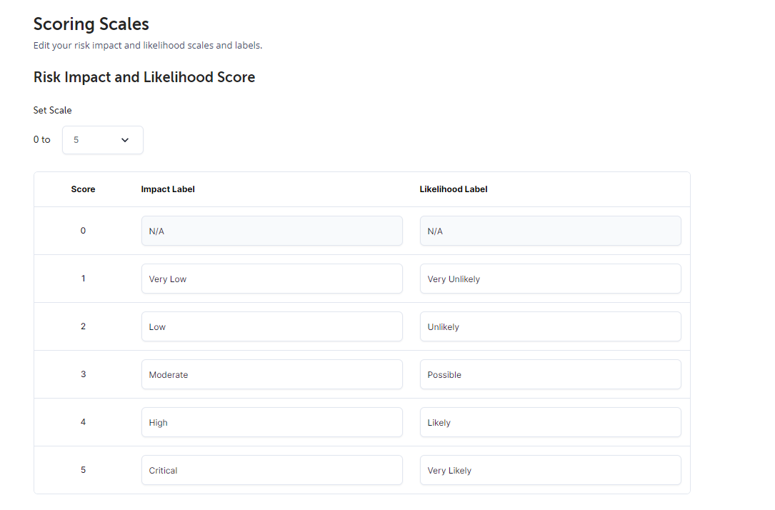 Once your Risk Impact and Likelihood scores are set, you can set these scales for your risks. See sections Create a New Risk and Edit or Delete a Risk for more details.