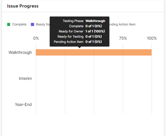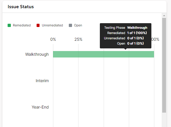 Within the Issues Status dashboard, when hovering over any of the Testing Phases progress bars, you will be able to gain insight into how many Remediated, Unremediated, and Open issues exist for each testing phase. You will be able to see the Status by amount and percentage for the Testing Phase you have set up.