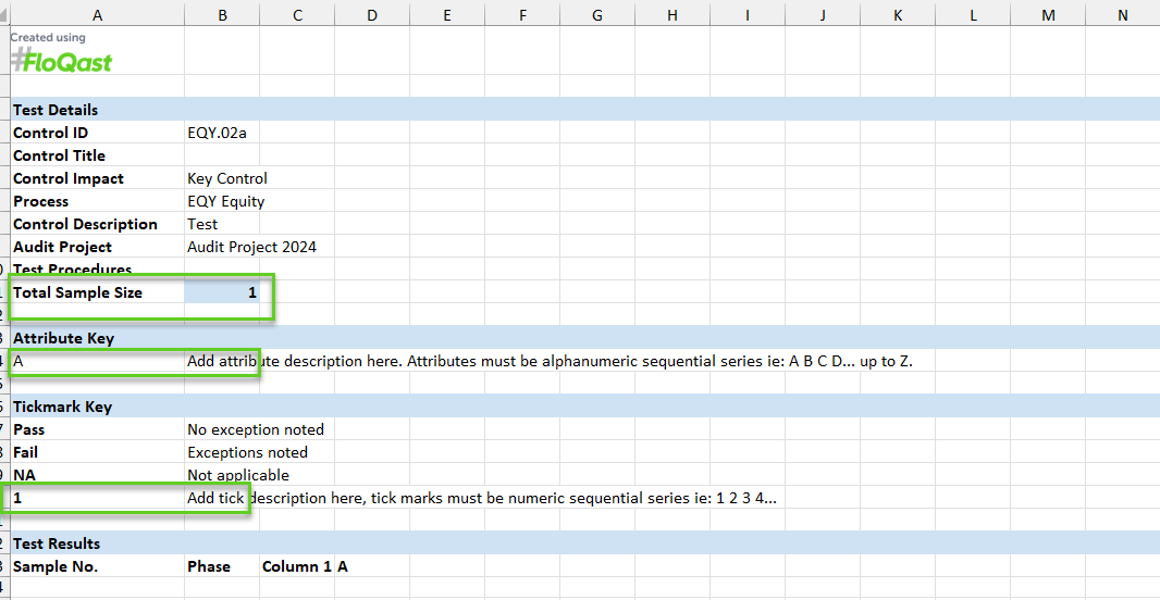 Within the Test sheet template, you can customize the sample size for the Test, add attributes for Testing, and create tick marks to apply to the Test results.