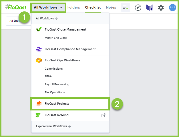 Any user can access FloQast Projects by navigating through the workflow navigation dropdown menu.