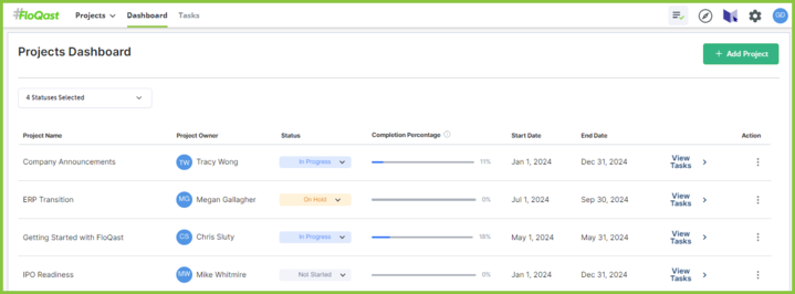 FloQast Projects is designed to help users efficiently track and manage recurring and non-recurring projects within the FloQast platform. This tool allows teams to stay organized, monitor progress, and collaborate effectively on various projects.