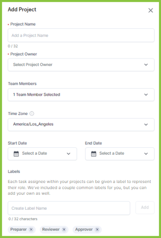 - Labels (Optional): Assignees in FloQast Projects can have labels to represent their role on a per-task basis. By default, the Preparer, Reviewer, and Approver labels will be created for you, but you can remove these if they’re not relevant to your project and add any additional/alternate labels you need.