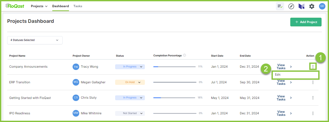 Projects can have five different statuses in FloQast Projects: Not Started, In Progress, Completed, On Hold, and Archived. You can update the status of a project from the Projects Dashboard in the Status column.