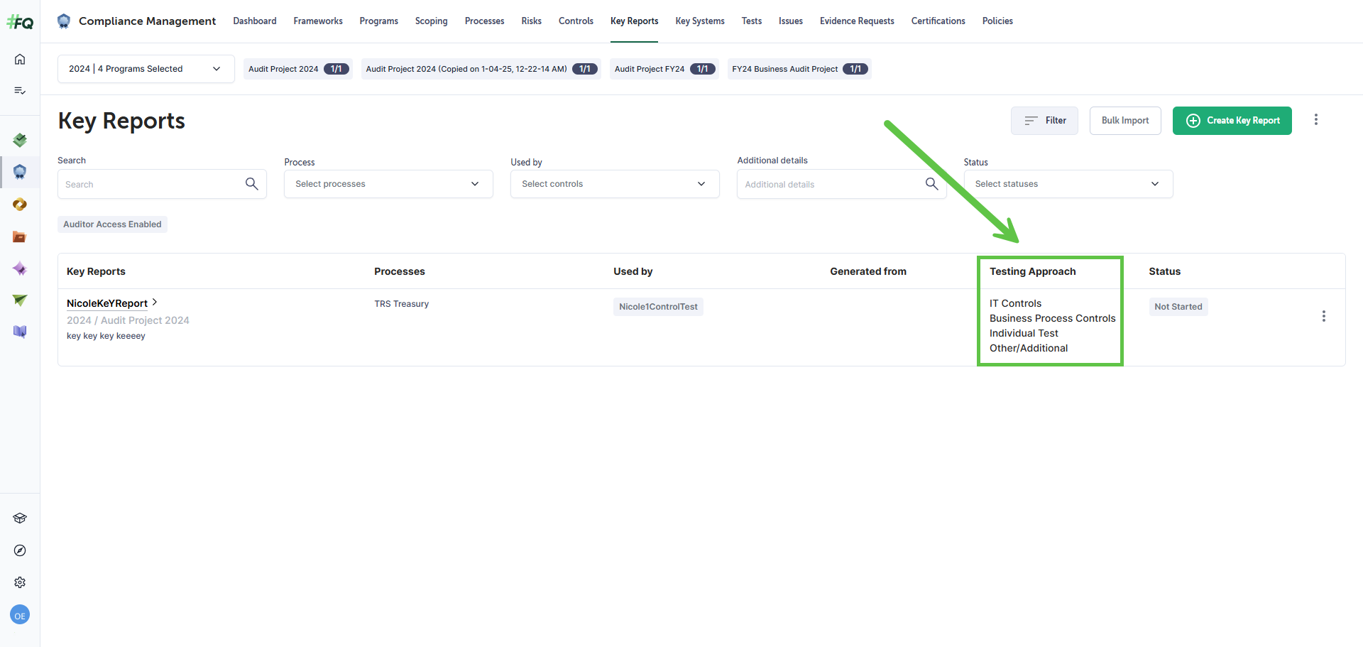 Once you have added your Testing Approach to a Key Report, you will see which approaches have been selected from the main Key Reports menu: