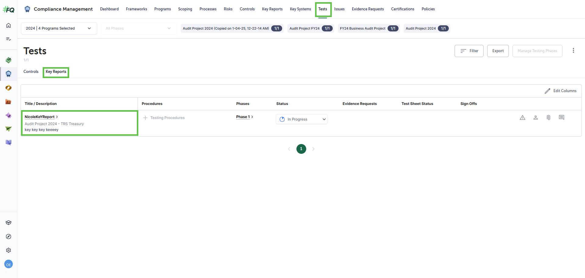 If you have selected Individual Test when completing the Testing Approach section, you’ll be able to navigate to the new Key Reports section under the Tests tab in order to add testing procedures and eventually complete your tests: