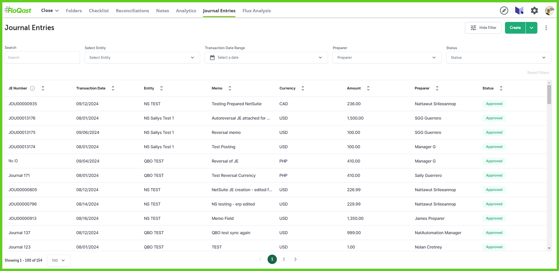 - Filter journal entries by Status or Preparer to take action.