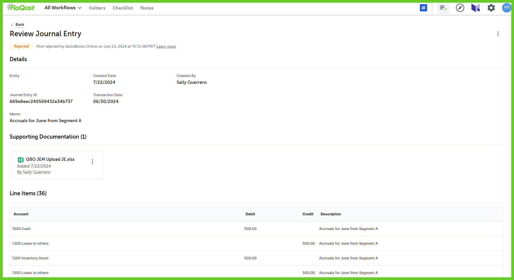 - Failed - The journal entry has failed to be transmitted to the ERP. It may or may not exist both in FloQast and the ERP, depending on previous activity.
