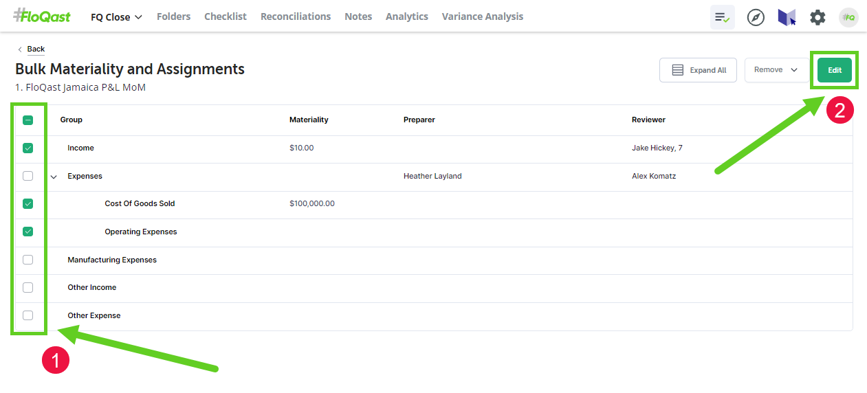 This feature allows you to update the group-level settings (such as Assignments and Materiality) for multiple groups within a Variance Analysis report.