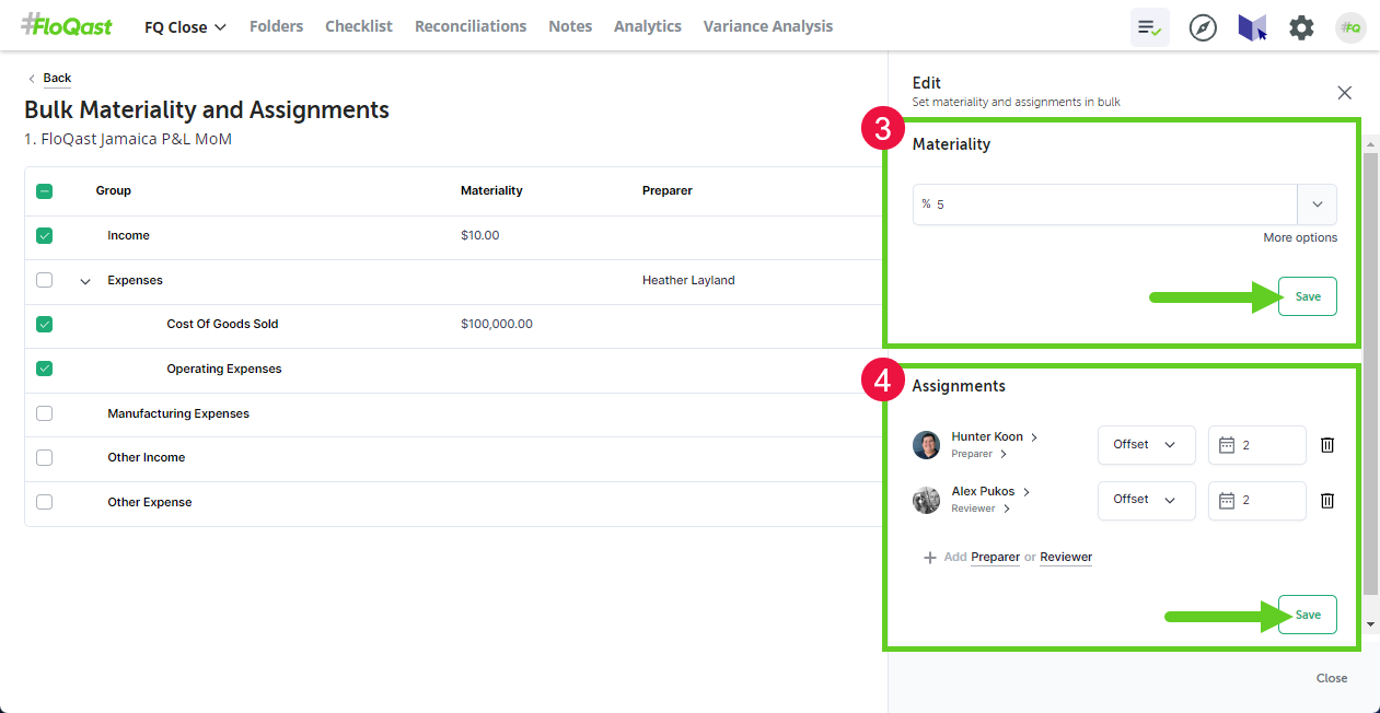 A flyout menu will appear on the right side of the screen. This is where you can set the Materiality (3) and Assignment (4) settings for your selected groups. Remember to click the “Save” button under each section to apply the changes!