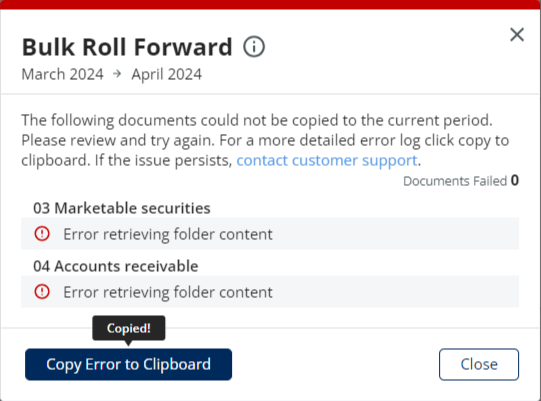 Keep in mind that you can only roll forward documents into a process folder that is currently empty. If the folder shows as empty in FloQast, but you receive an error, review the folder's contents within your cloud storage as files may have been placed there, but the Refresh button within FloQast may not have been clicked yet to reflect them. If, by chance, you only roll forward a few of the documents you need, you can actually roll forward again, once the files are removed from the corresponding cloud storage folder.