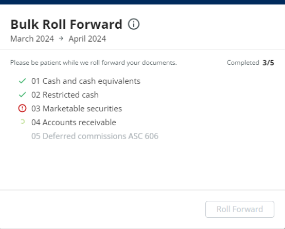 When the documents have been selected and re-named, as needed, click the Roll Forward button to move them forward to the new period in FloQast. In addition to the documents being moved forward in FloQast, these documents will also be replicated in your cloud storage system. The prior period does not have to be closed in order to use the roll forward functionality.