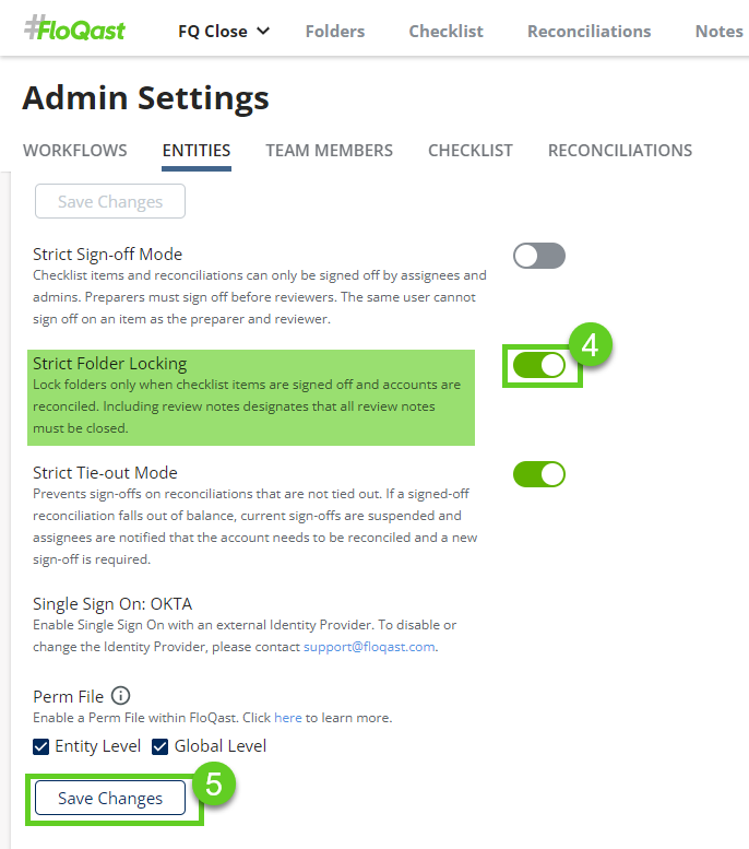 Enabling Strict Folder Locking (under Manage Entities) will allow you to lock folders only when checklist items are signed off, accounts are reconciled, and review notes (if any) are closed.