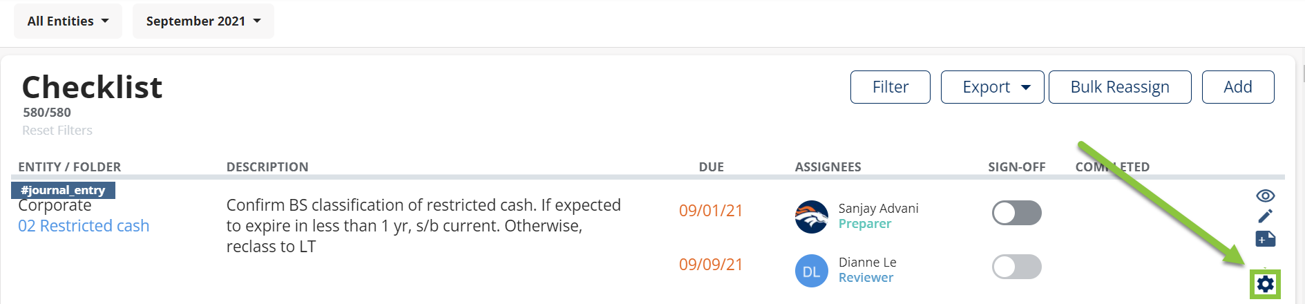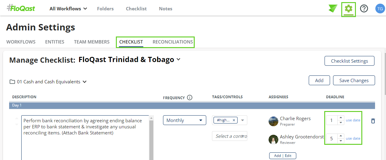 FloQast Admins can update deadlines via the "Checklist" or "Reconciliations" tabs under their Admin Settings or through Inline Editing by clicking the gear icon to the right of the Reconciliation or Checklist Item.