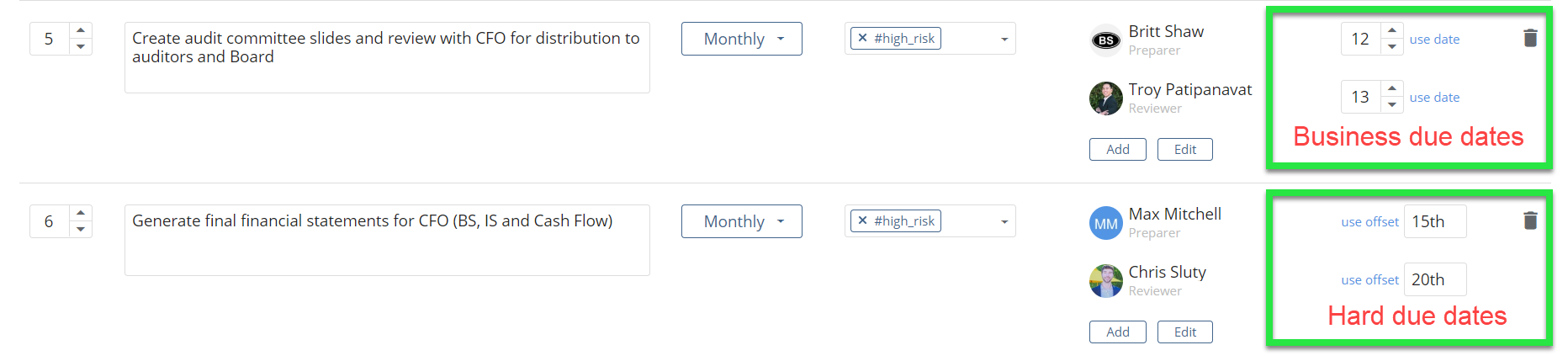 You can also see hard due dates- the item needs to be prepared by the 15th and reviewed by the 20th of the month.