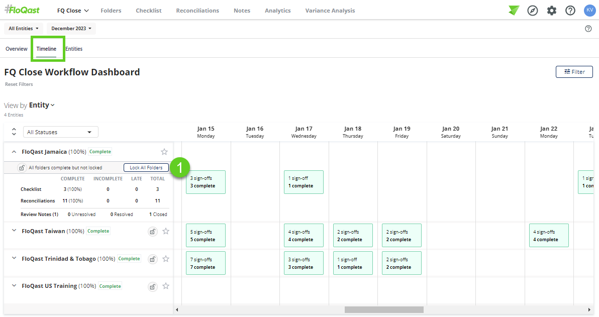 If you prefer to lock all folders for a given month simultaneously, you can do so on the Single Workflow Dashboard, as shown in the screenshots below. Work in all folders must be completed to lock from the Dashboard. You can lock all folders in an entity by visiting the Timeline tab and viewing the timeline by Entity. You can also visit the Entities tab.