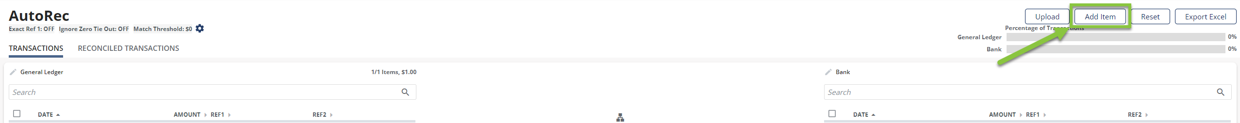 You may add a single transaction to the AutoRec Matching module using the Add Item button: