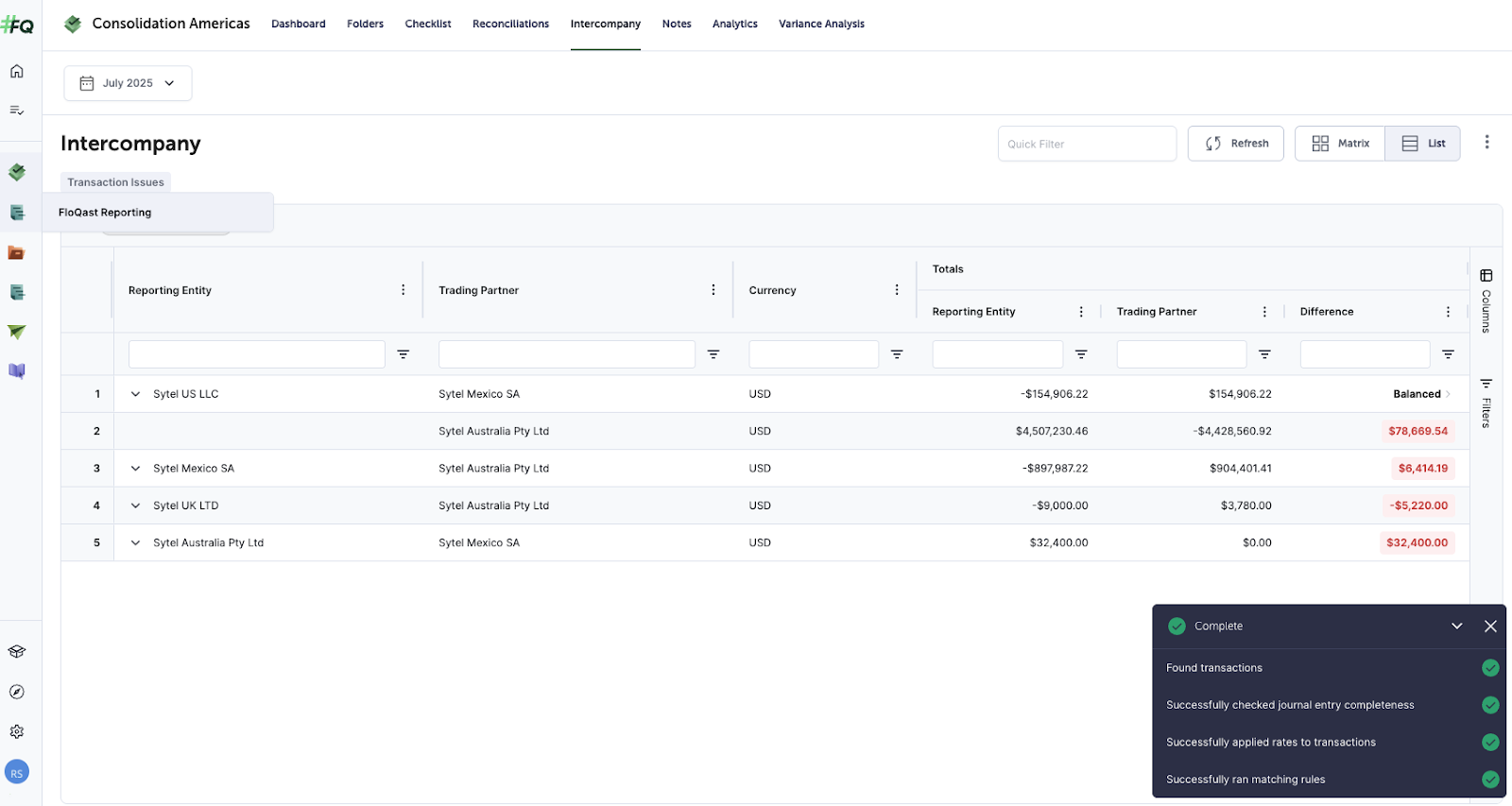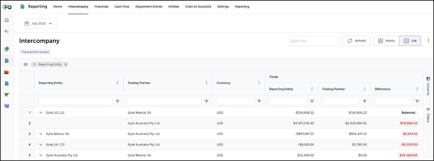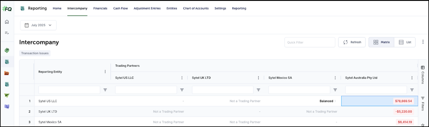 - Quick Filter: If you select Transaction Issues to the left of the page under Intercompany on either the Matrix or List Views, to the left of Matrix View, it will remove columns or rows where there is no data, Not a Trading Partner, and/or it’s ‘Balanced’, leaving only those relationships where imbalances exist.