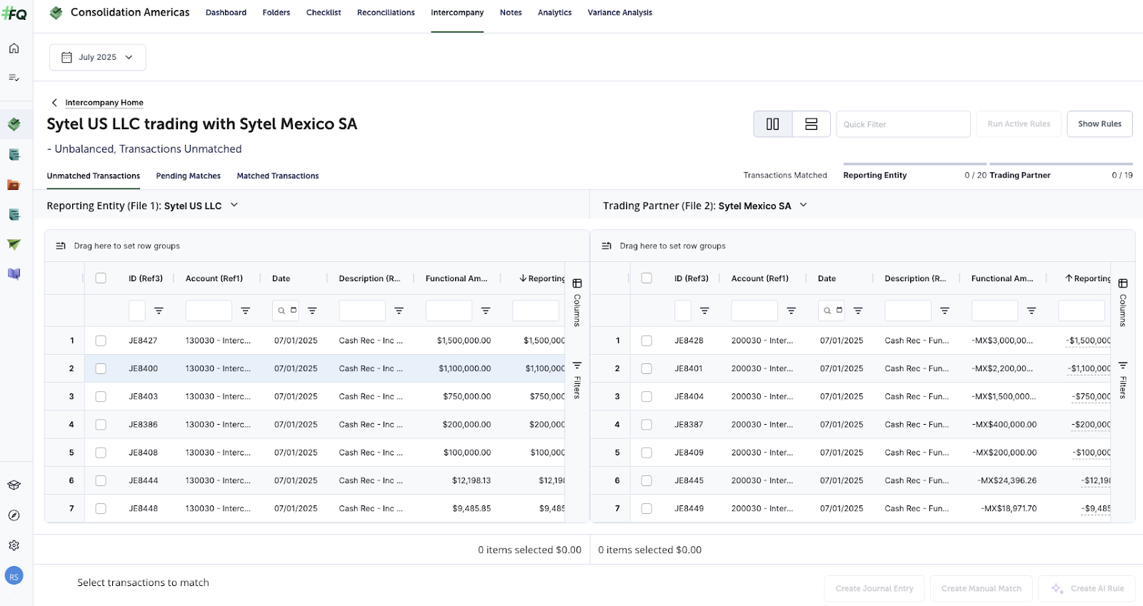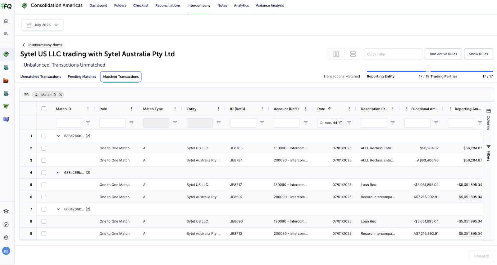 - Matching View - Unmatched Transactions: From either the Matrix or List Views, if you select any amount (or ‘Balanced’) it will take you to the Matching View - Unmatched Transactions for the specific entity relationship you selected. This is a list of all intercompany transactions for the entity relationship selected. From the unmatched tab, you can create a manual match or create an AI Rule.