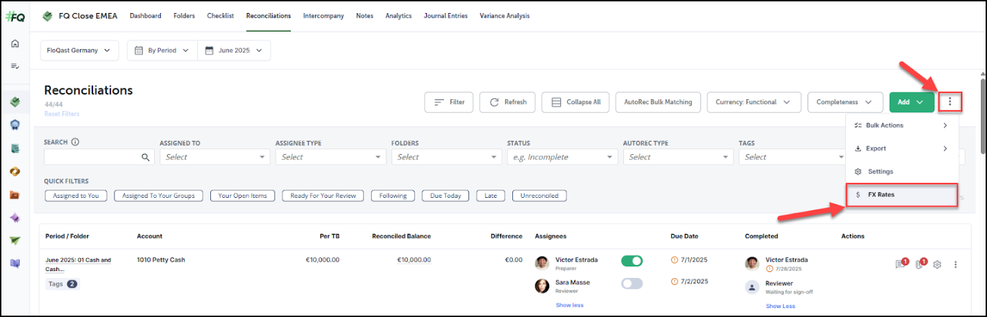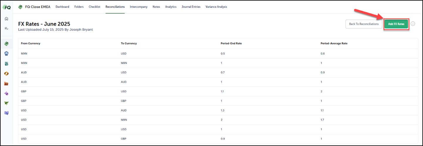 The purpose of managing FX rates in FloQast is to allow you to create and upload your own FX rates, which will be used during FX translations. We recommend users add a monthly checklist item to their close workflow to update the rates. FX Rates for Intercompany are loaded from the Reconciliation tab. The user will need to ensure they select the appropriate period prior to loading the rates.