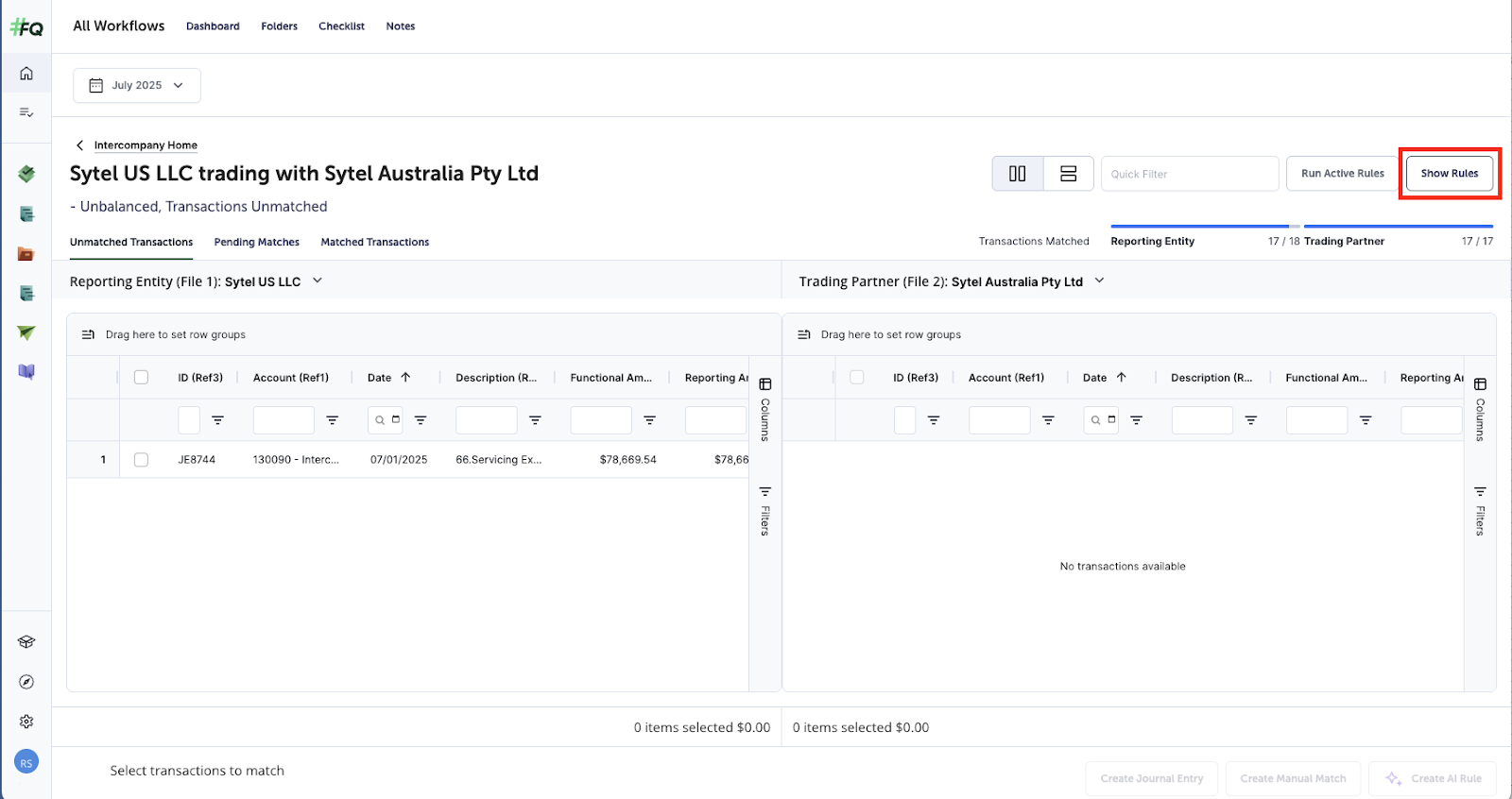 - Matching Rules Drawer: Located in the upper-right corner of the Transactions Detail Matching page, the Show Rules button opens the Matching Rules drawer.