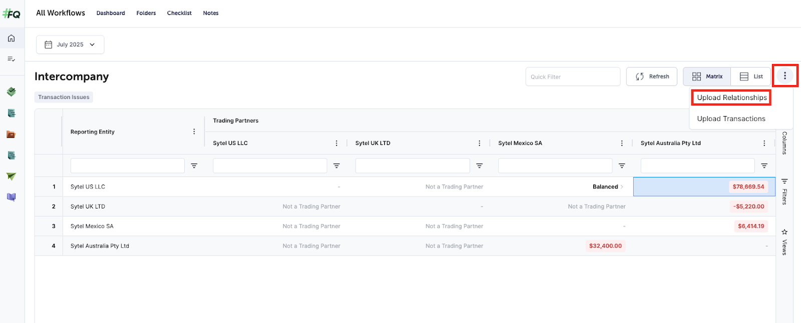 - From the Intercompany tab, navigate to the 3 dots and select Upload Relationships.