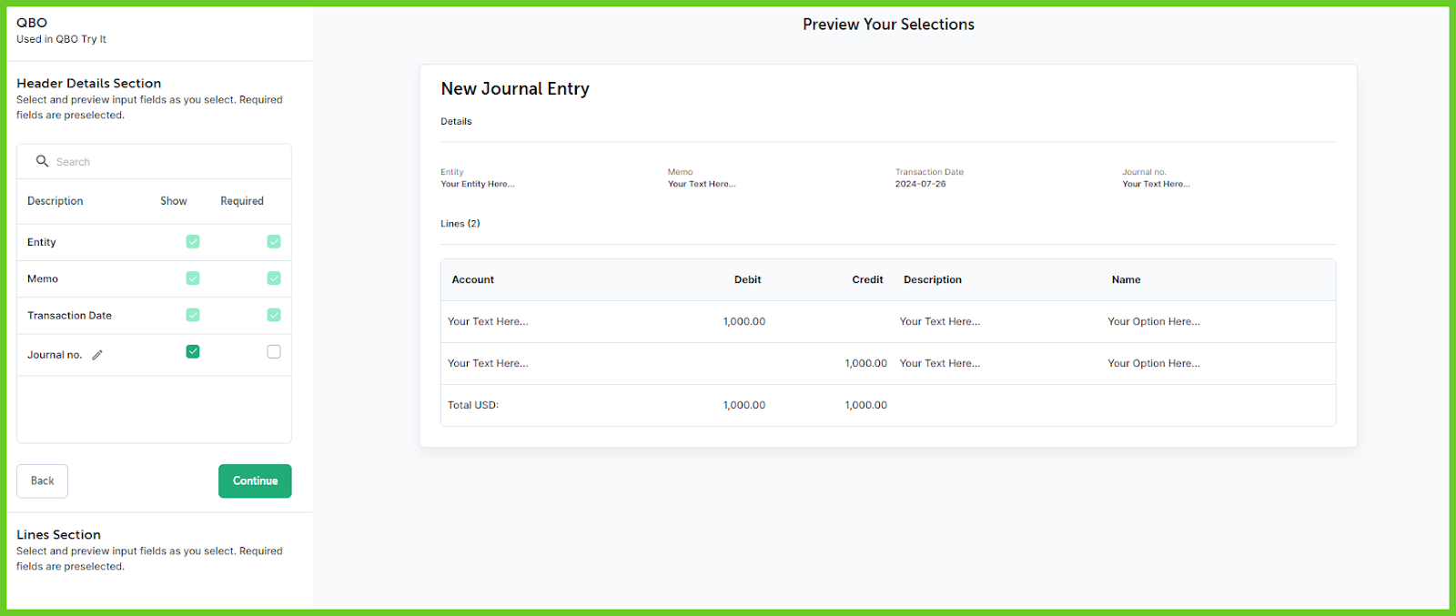 A: The Journal Entry Field names must exactly match the field names in your ERP. If the names aren’t an exact match from the Module to the Journal Entry, the field will not populate within the Journal Entry.