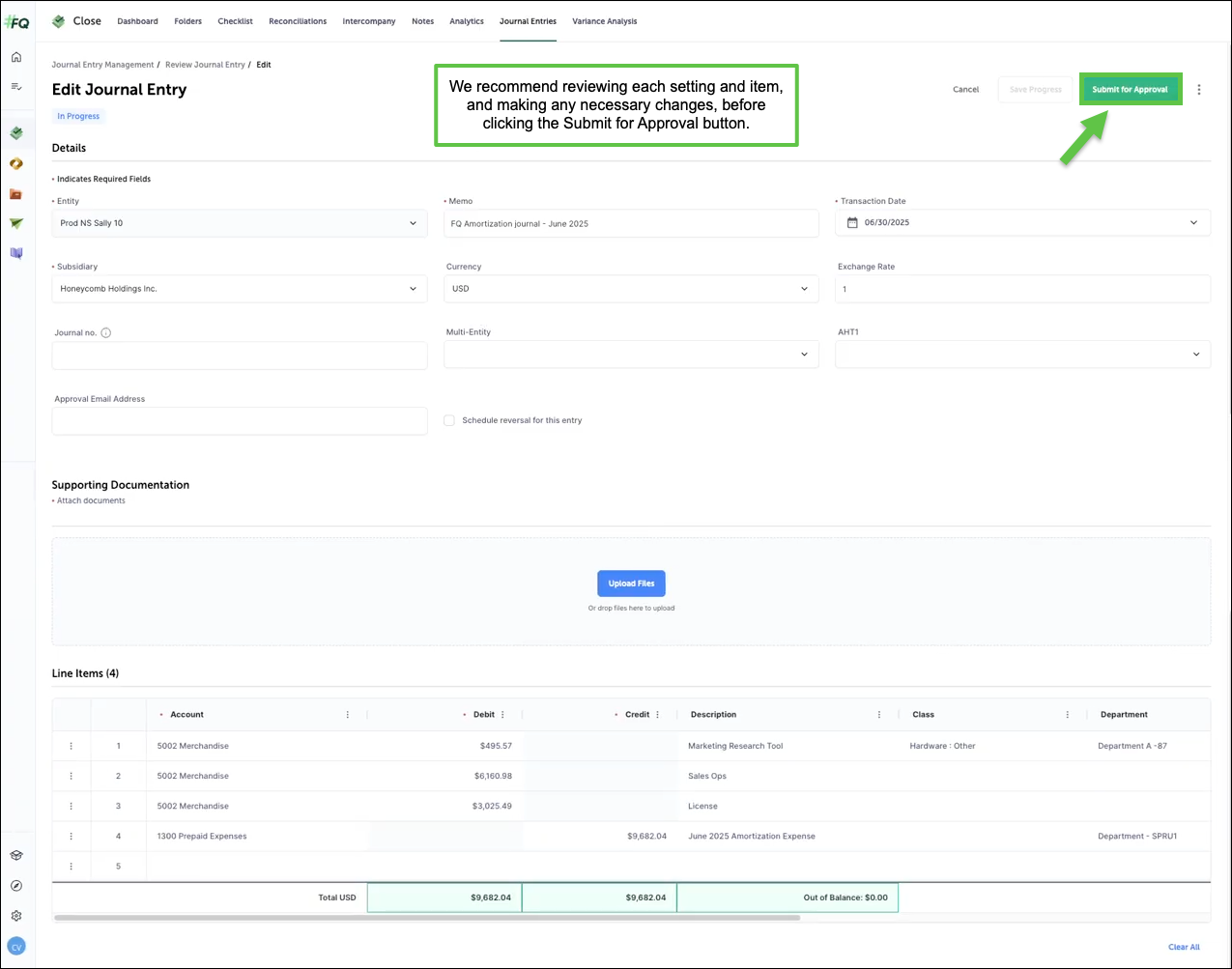 When the JEM module opens, you can review each setting and line item, and make any edits if necessary. Once satisfied with the entry, you can click on the Submit for Approval button.