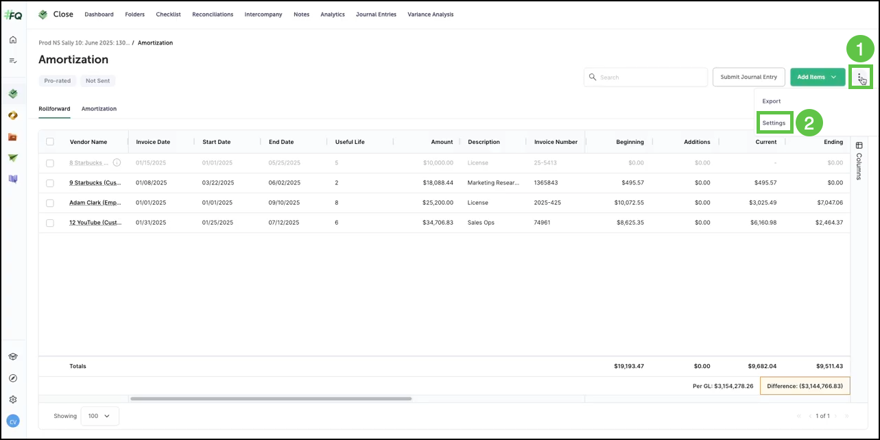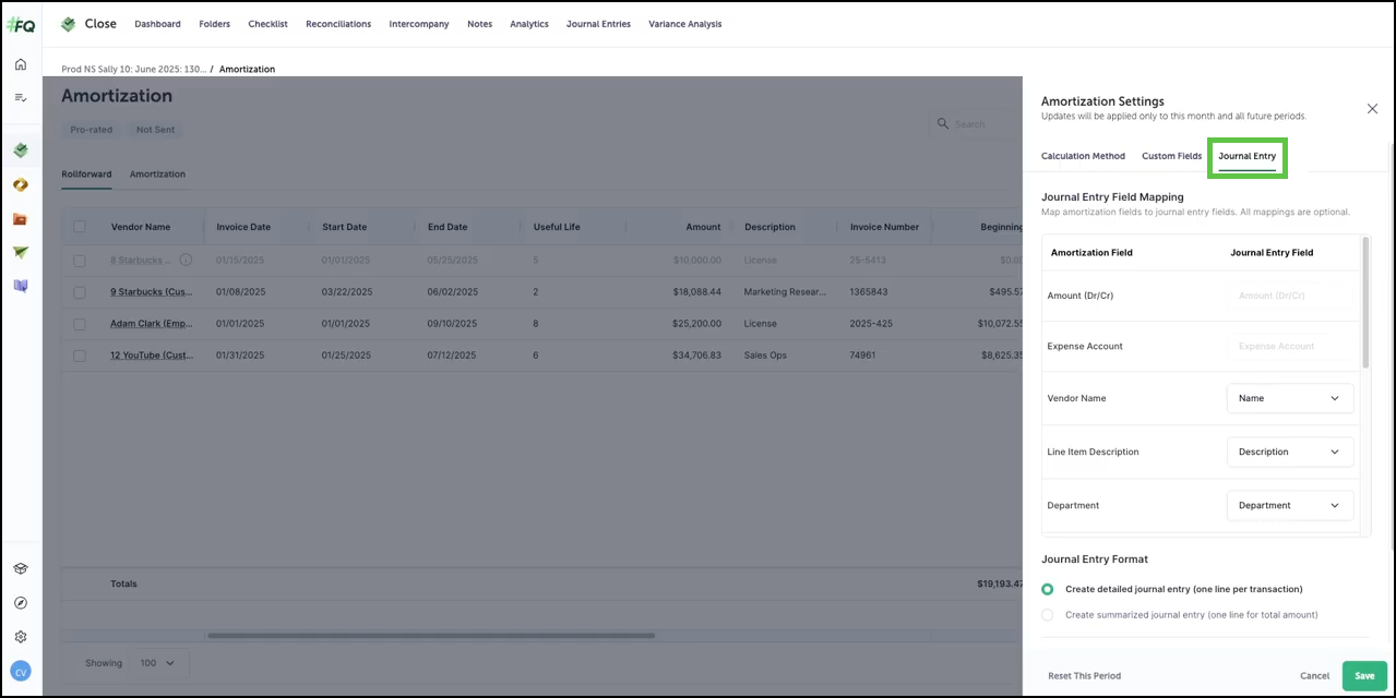 Once the fields are filled out, you can open up your Amortization or Depreciation schedule, and navigate to the Journal Entry tab under the Settings slideout window.