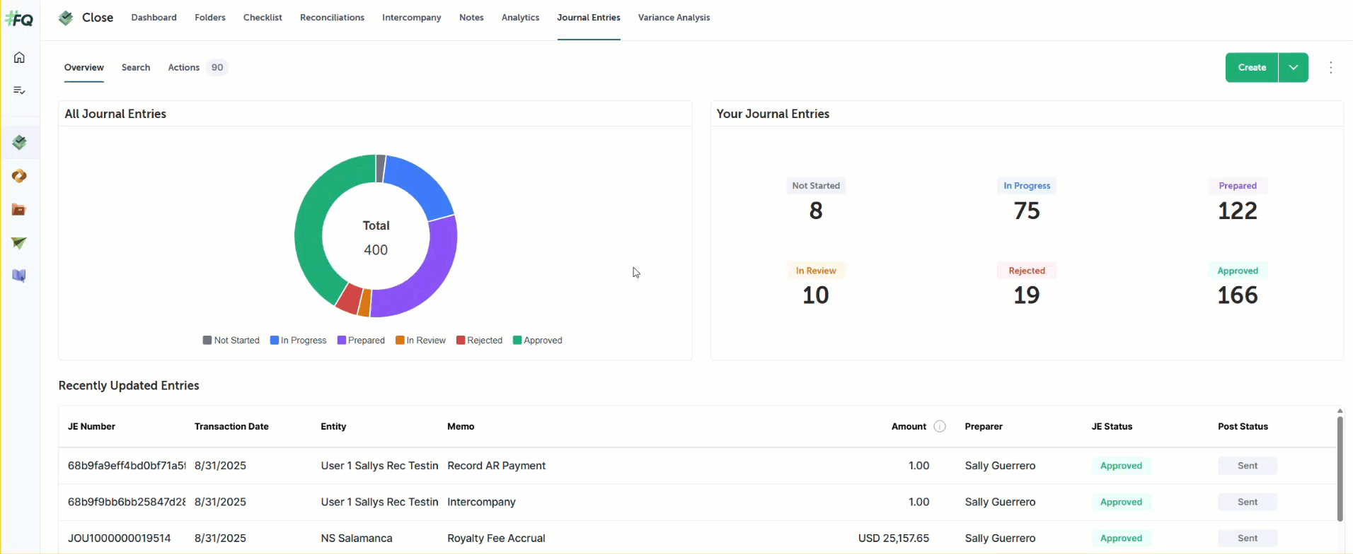 The Actions View displays different sections based on your assigned role and the status of each journal entry: