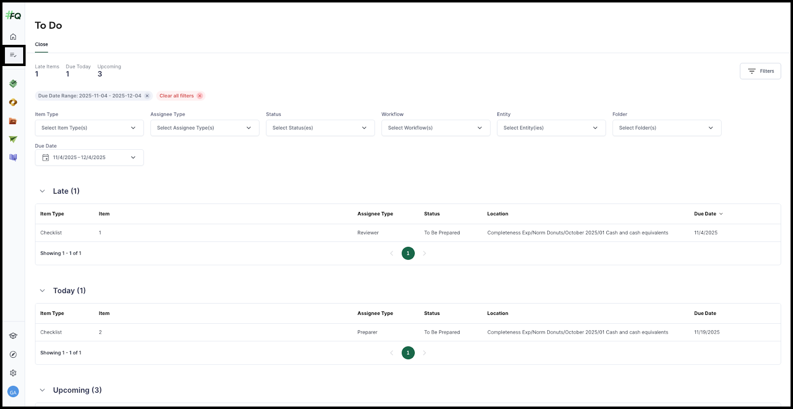 The To Do List provides a centralized view of your tasks in FloQast, helping you prioritize your work efficiently. Located directly in the main navigation, it aggregates all your assigned Checklist and Reconciliation items, organizing them by due date so you can easily see what needs your immediate attention.