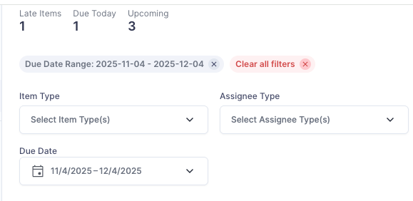 - Late: Items with a due date in the past (yesterday or prior).