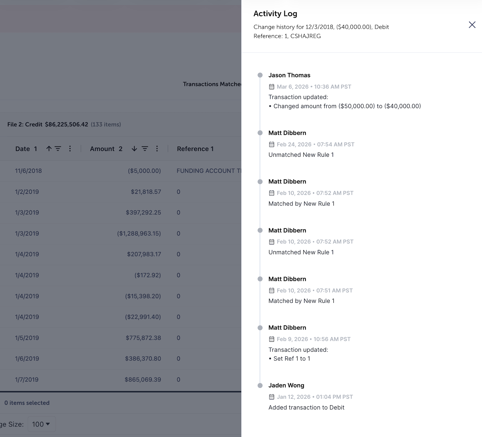 You can now manage your data more flexibly within AI Matching by adding, editing, or deleting transactions directly in the interface. This update eliminates the need to re-import entire datasets for minor corrections and includes the ability to restore deleted transactions if they were removed in error. Furthermore, a new activity log provides full visibility into transaction changes, matching actions, whether manual, rule-based, or via journal entry, and rollforwards.