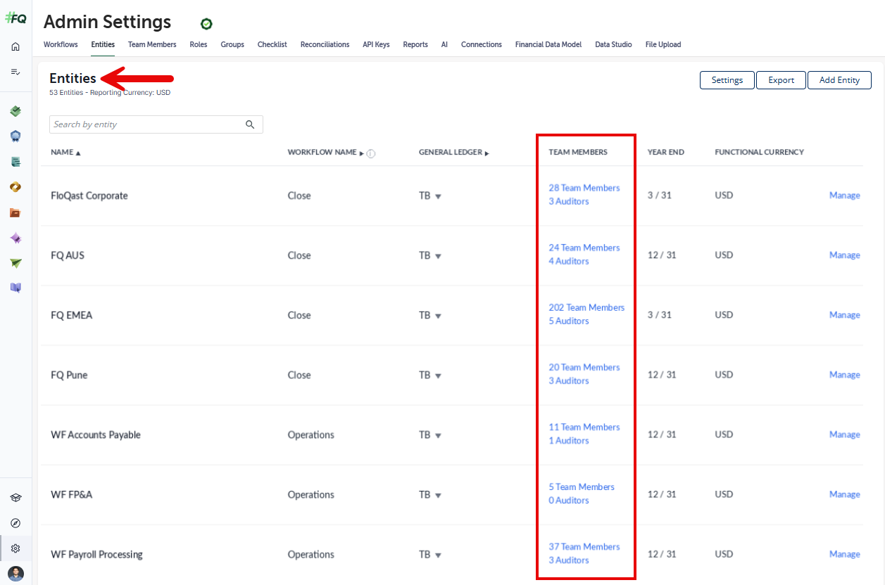 Admins can now manage entity assignments directly from the Entities page in Admin Settings. A new "Team Members" column has been added which displays the current count of team members and auditors for each entity. Clicking these counts opens a management slide-out where you can manage which users have access to the entity along with their Entity Role (for Adv Users).