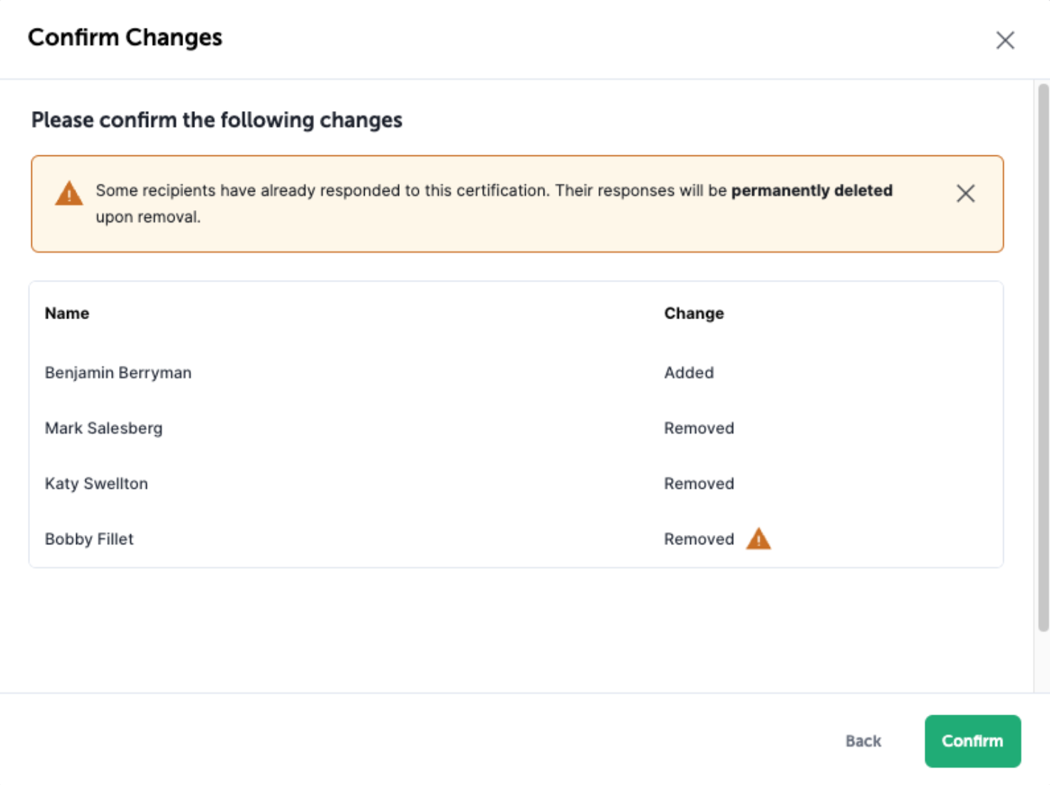 You can now add or remove recipients in Standard Certifications even after a round has started. Previously, any changes required setting up a new certification, leading to incomplete rounds or unnecessary workarounds. This update allows you to manage recipients directly from the drill-down page. If a recipient who has already responded is removed, a warning will appear notifying you that their response will be permanently deleted. This improvement streamlines certification management and reduces the need for manual adjustments.