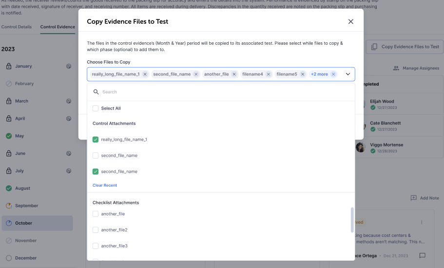 We've updated the UI for copying evidence files from controls to tests. You can now select specific files to copy and choose the testing phase they should be copied to.