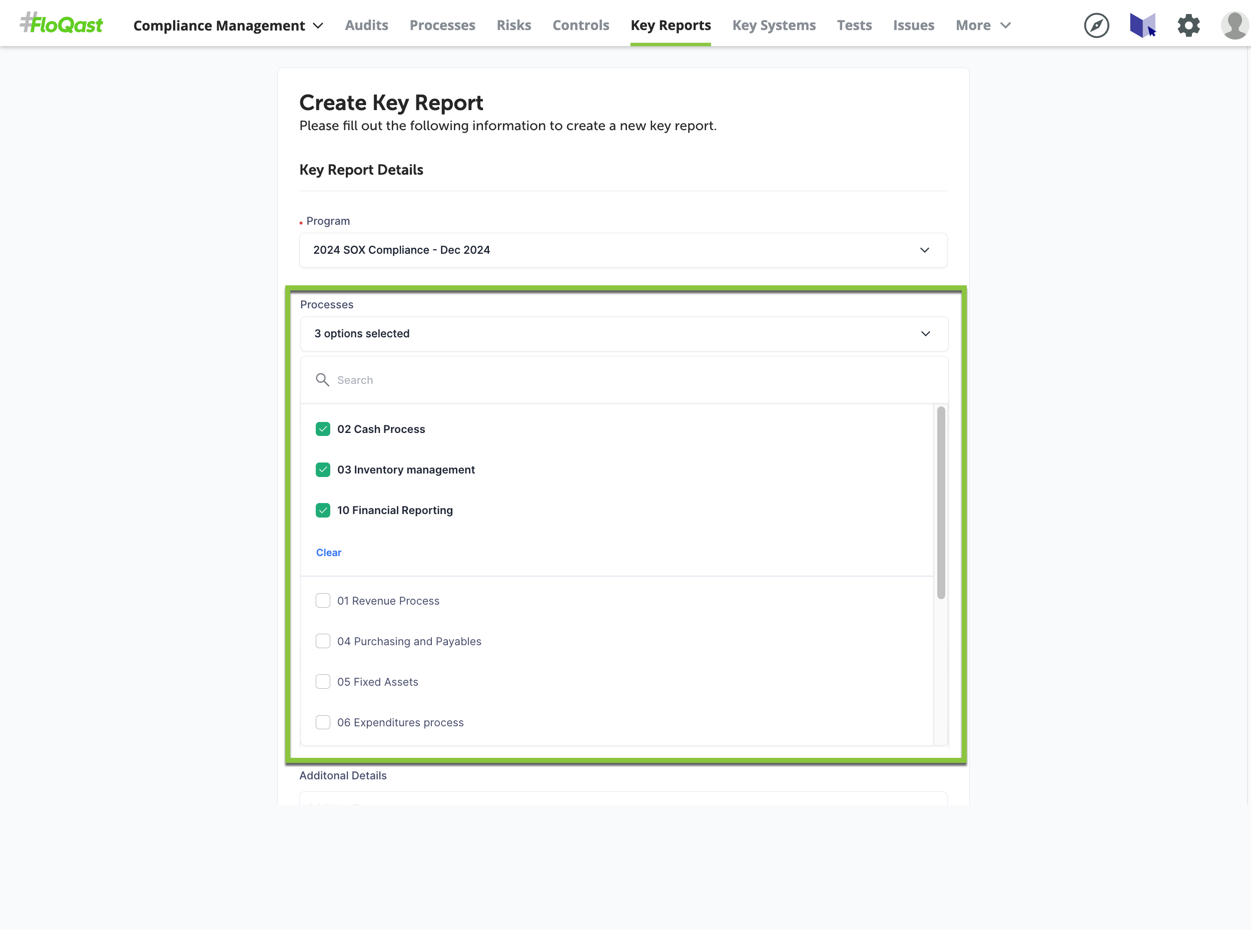 Key reports can now be linked to multiple processes—or no process at all—both in the platform and through bulk import. This update provides greater flexibility in organizing key reports, such as financial statements, across multiple processes. Please note that when creating a key report test, a process must still be selected to store all testing documentation, as documentation is housed by process.