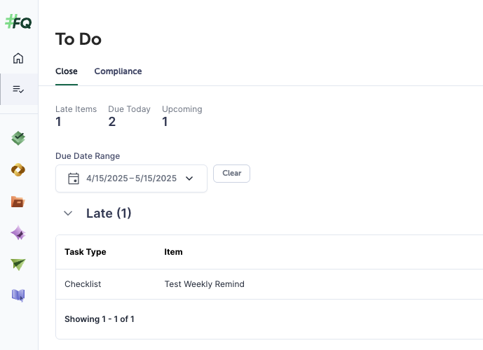 The Close To-Do List now includes a customizable date filter and a new Status of Items column to help you prioritize work more effectively. You can limit the view of late, due today, and upcoming tasks to a specific date range, with a default view of ±15 days from today. This filter persists even if you navigate away. Additionally, a new status attribute makes it easy to see which items are ready for review without opening each task, improving how you triage and manage your close tasks.