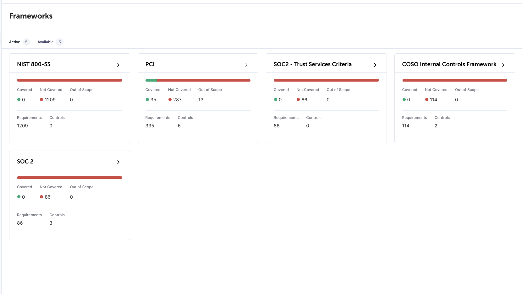 You can now assess framework coverage directly within the Compliance Frameworks module. For each framework requirement, mark it as Covered, Not Covered, or Out of Scope to track how your controls align to your compliance obligations. You can also filter by linkage status, keywords, or coverage to focus your efforts. This update helps you monitor progress more effectively and identify any gaps in your framework coverage.