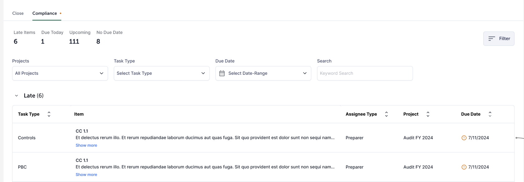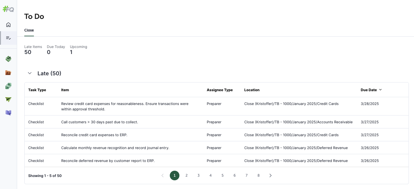 The new Close To-Do List provides a central hub for all assigned tasks across Checklists and Reconciliations. You can now view all late, due today, and upcoming tasks—no longer limited to a 7-day window. The redesigned interface offers a cleaner, more efficient experience, helping you quickly identify and take action on your assigned items.