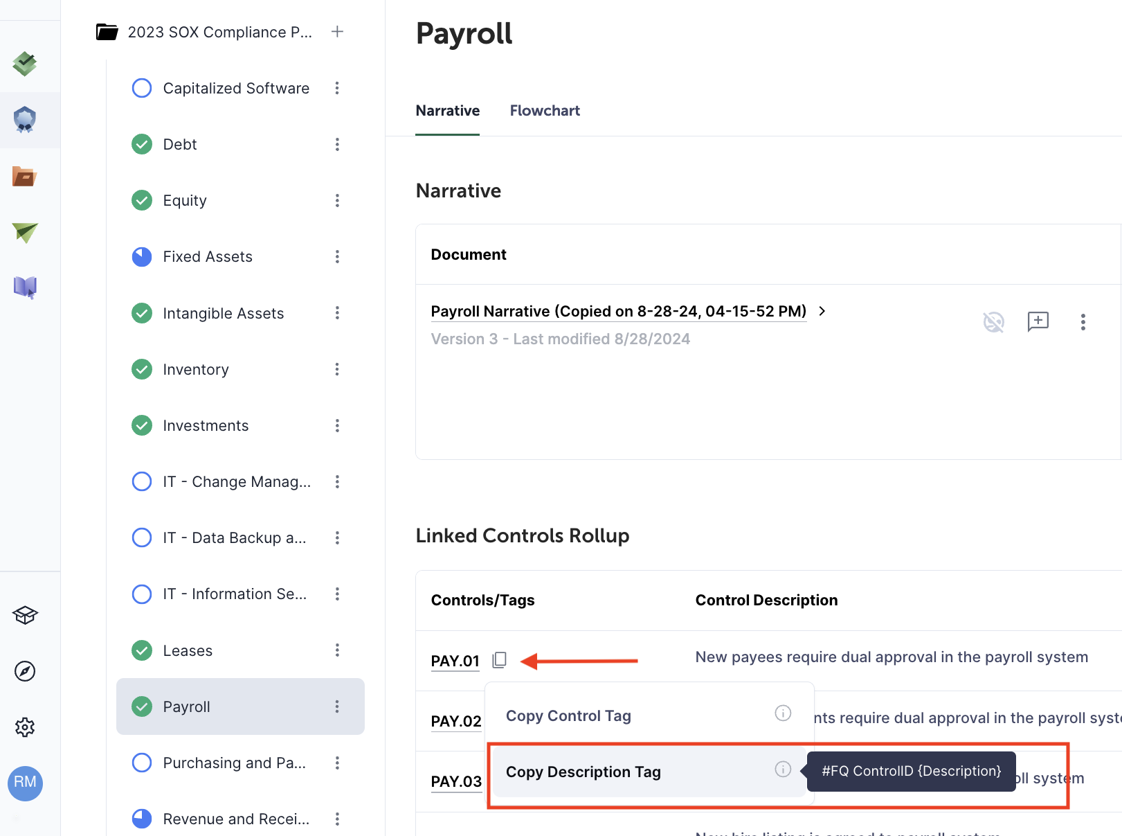 You can now copy the FQ Reference and FQ Control Description tags directly from the Linked Controls Table with a single click. A new copy icon appears next to each tag, making it easy to paste them into narratives or flowcharts without manually retyping or tracking them elsewhere. This update helps reduce tagging errors and saves time across your compliance documentation workflow.